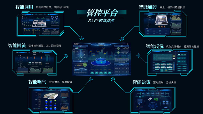 BAF智慧濾池?fù)碛兄悄苷{(diào)用、智能回流、智能反洗、智能加藥、智能曝氣、智能決策六大板塊,六駕“馬車”齊發(fā)力,充分發(fā)揮AI 人工智能在水廠運(yùn)營中的有力作用。智能調(diào)用系統(tǒng)自動計(jì)算濾池運(yùn)行數(shù)量,根據(jù)用戶需求交替啟用,確保冬季低溫下出水水質(zhì)穩(wěn)定達(dá)標(biāo),同時降低曝氣能耗;智能回流系統(tǒng)實(shí)時調(diào)控回流比,解決了硝化液回流過量的問題,確保濾池精準(zhǔn)脫氮,大幅節(jié)省電耗;針對不同功能的濾池,智能反洗系統(tǒng)通過選用循環(huán)洗、降水位反沖洗、強(qiáng)制反洗等模式,提高反洗效率,降低反洗頻次,節(jié)省電耗;智能加藥系統(tǒng)結(jié)合進(jìn)水水質(zhì)水量,AI智能投加反硝化碳源,確??偟_(dá)標(biāo)的前提下大幅度降低藥耗;智能曝氣系統(tǒng)充分考慮氣泡經(jīng)濾料剪切帶來溶解氧升高的影響,實(shí)現(xiàn)按需供氧,降低曝氣能耗;智能決策系統(tǒng)根據(jù)運(yùn)營需求,對不同控制模塊的經(jīng)濟(jì)性、安全性、穩(wěn)定性進(jìn)行綜合比選,制定精準(zhǔn)、有效的控制方案。