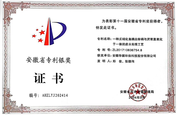 9月3日,安徽省市場監(jiān)督管理局(安徽省知識產(chǎn)權局)公示了第十一屆安徽省專利獎評選結果。華騏環(huán)?!耙环N反硝化集耦合除磷與厭氧氨氧化于一體的廢水處理工藝”發(fā)明專利榮獲安徽省專利銀獎。