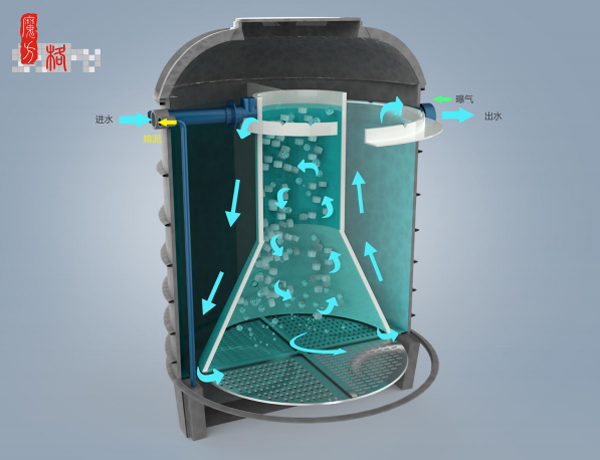 魔方格產品。主要是針對村落分散處理模式,單套5m3/d,可串并聯(lián)組合使用。裝備采用“渦輪循環(huán)往復泥膜耦合脫氮除磷技術”,它是利用渦輪反應區(qū)的水氣動力形成高度流化并自流至缺氧厭氧區(qū)形成往復循環(huán)處理,實現(xiàn)有機物及氮磷的去除。其技術優(yōu)勢中部的流化床狀態(tài),傳質效果好,微生物活性強,耐沖擊負荷強,去除效果穩(wěn)定;同時整個設備僅配置一臺進口氣泵,故障點少,運行節(jié)能穩(wěn)定。另外設備采用高分子材料一次成型,使用壽命長所以特別適合農村小微場合應用。