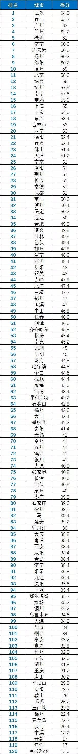 2019年,環(huán)保公益組織公眾環(huán)境研究中心通過搜集政府公開信息,對(duì)全國120個(gè)環(huán)保重點(diǎn)城市的水質(zhì)信息公開進(jìn)行評(píng)價(jià),該表為水質(zhì)信息公開指數(shù)排名,排名越靠前公開質(zhì)量越高。