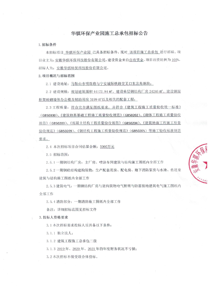 華騏環(huán)保產(chǎn)業(yè)園施工總承包招標(biāo)公告