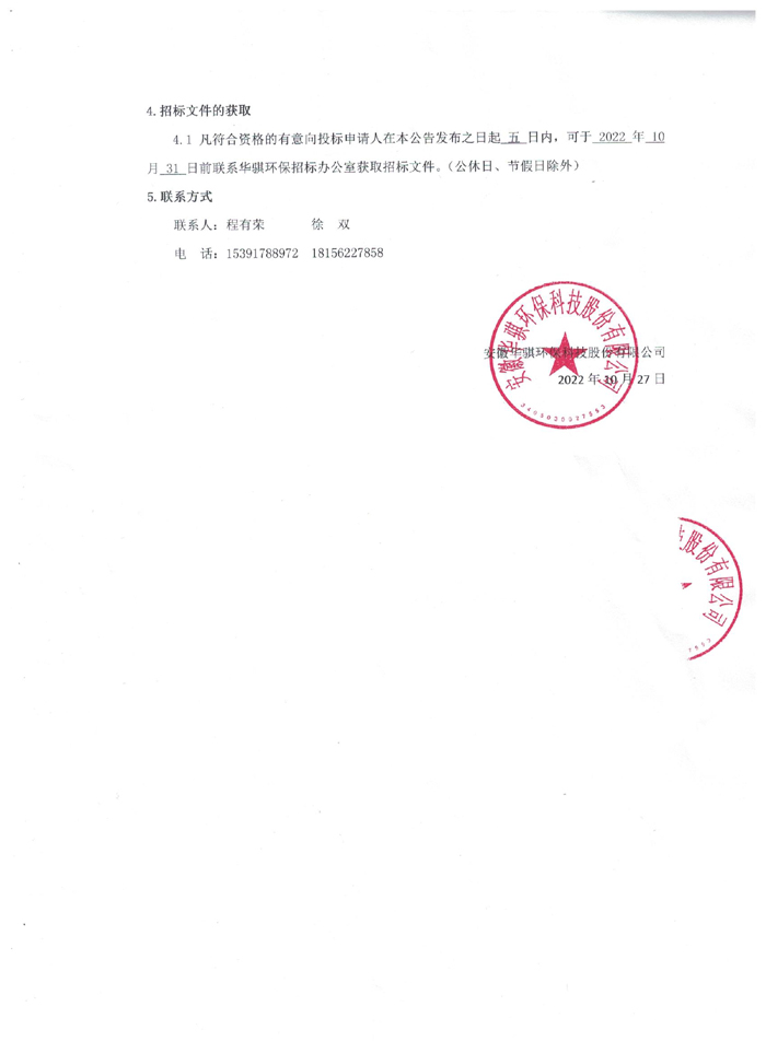 4.1 凡符合資格的有意向投標(biāo)申請(qǐng)人在本公告發(fā)布之日起 五 日內(nèi),可于 2022 年 10 月 31 日前聯(lián)系華騏環(huán)保招標(biāo)辦公室獲取招標(biāo)文件。(公休日、節(jié)假日除外)