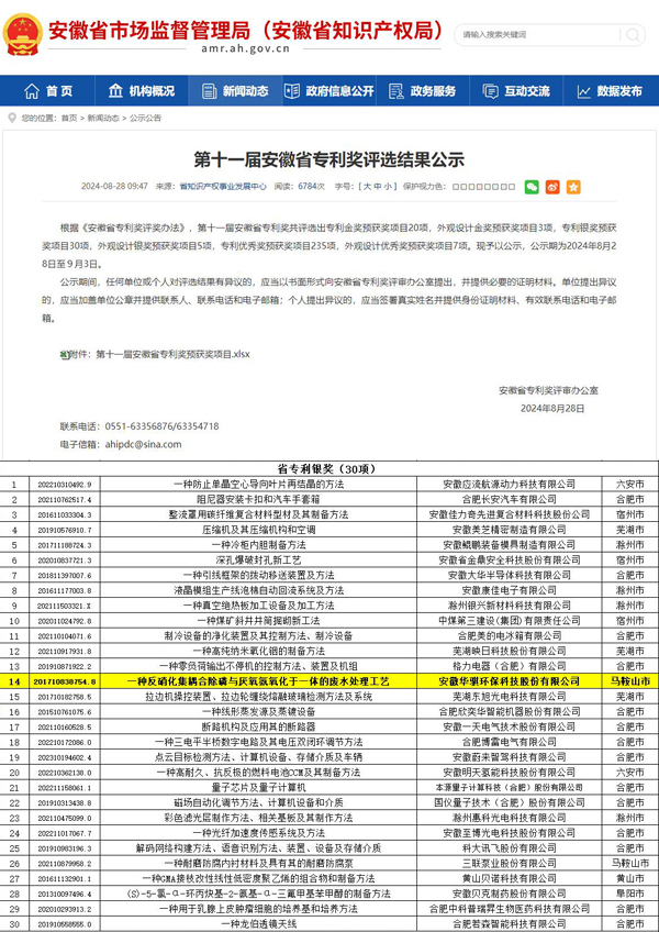 近日,安徽省市場(chǎng)監(jiān)督管理局(安徽省知識(shí)產(chǎn)權(quán)局)公示了第十一屆安徽省專利獎(jiǎng)評(píng)選結(jié)果。安徽華騏環(huán)??萍脊煞萦邢薰尽耙环N反硝化集耦合除磷與厭氧氨氧化于一體的廢水處理工藝”發(fā)明專利榮獲安徽省專利銀獎(jiǎng)。