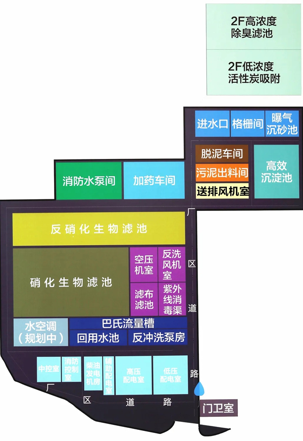 污水廠加蓋封閉除臭,華騏環(huán)保采用了高、低濃度兩套除臭系統(tǒng),高濃度臭氣采用生物濾池除臭,低濃度臭氣采用活性炭吸附除臭,尾氣通過(guò)綜合大樓專(zhuān)用排放管道100m高空排放,有效解決了臭氣對(duì)周邊居民的影響,衛(wèi)生防護(hù)距離縮小至零。