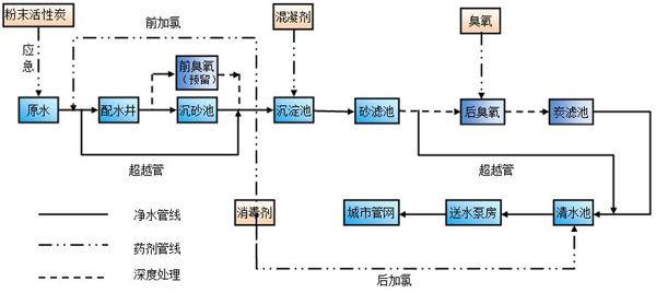 重慶市悅來水廠二期工程設(shè)計(jì)規(guī)模20×104m3/d,位于重慶市渝北區(qū)悅來街道及雙龍湖街道,主要工程內(nèi)容包括取水工程、凈水工程、輸配水?dāng)U建工程。水源地選擇在水量充沛、水質(zhì)較好的嘉陵江悅來段,一期取水工程已按40.0萬m3/d進(jìn)行土建,本期設(shè)備增容20.0萬m3/d。凈水工程主要生產(chǎn)構(gòu)筑物按20.0萬m3/d建設(shè),凈水廠工藝流程采用常規(guī)凈水處理+深度處理工藝。常規(guī)凈水處理工藝為沉砂+絮凝沉淀+過濾+消毒,深度處理工藝為O3-BAC。管網(wǎng)輸配水能力按2020年60.0萬m3/d總體布置,分期分步實(shí)施。
